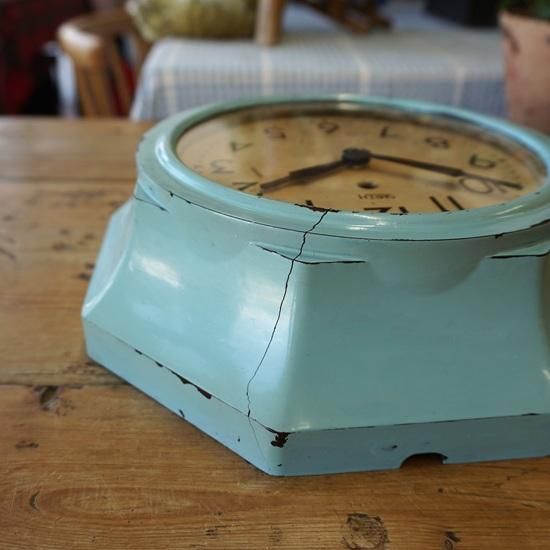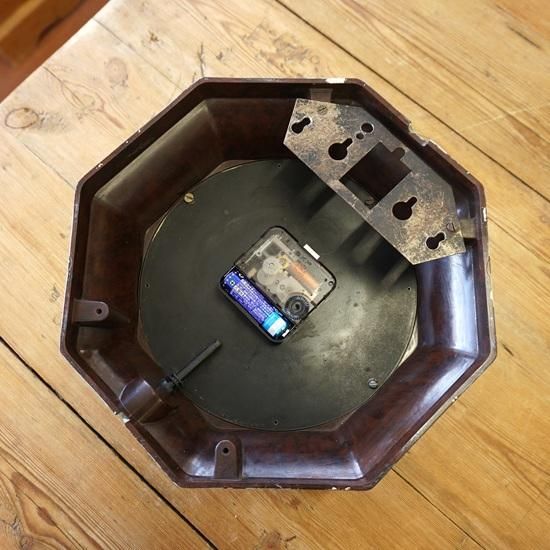 希少な八角形の時計ですが、ベークライトの枠に1か所ヒビが入っていますので価格は下げております。枠の上部なので掛けてしまえば目立ちませんし、ちょうど裏にある壁掛け金具の間なのでこれ以上隙間が広がることも無いと思います。